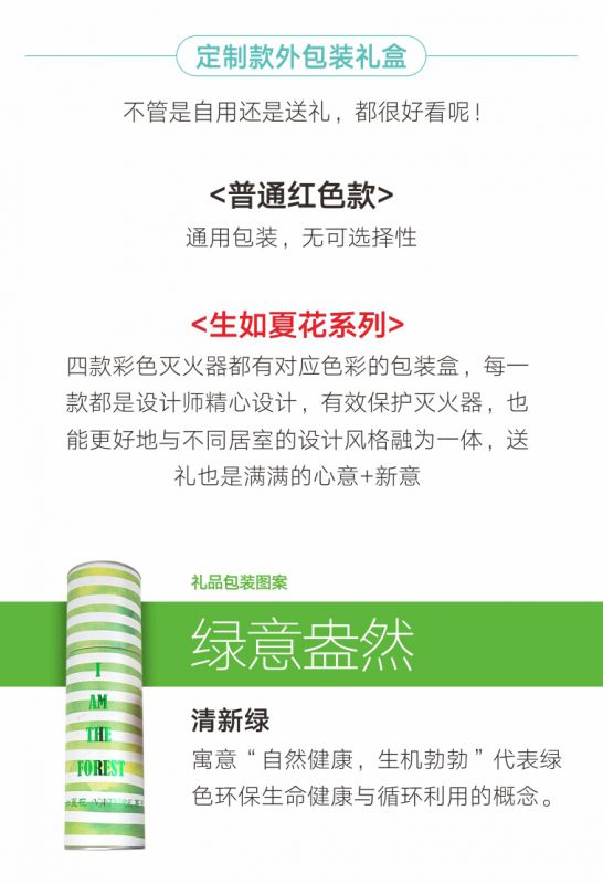 资质报告齐全,规格型号均有。更有彩色生如夏花灭火器(五年免维护)等多种升级款,适用送礼、家用、车载、办公、企业福利、加油站等场所。