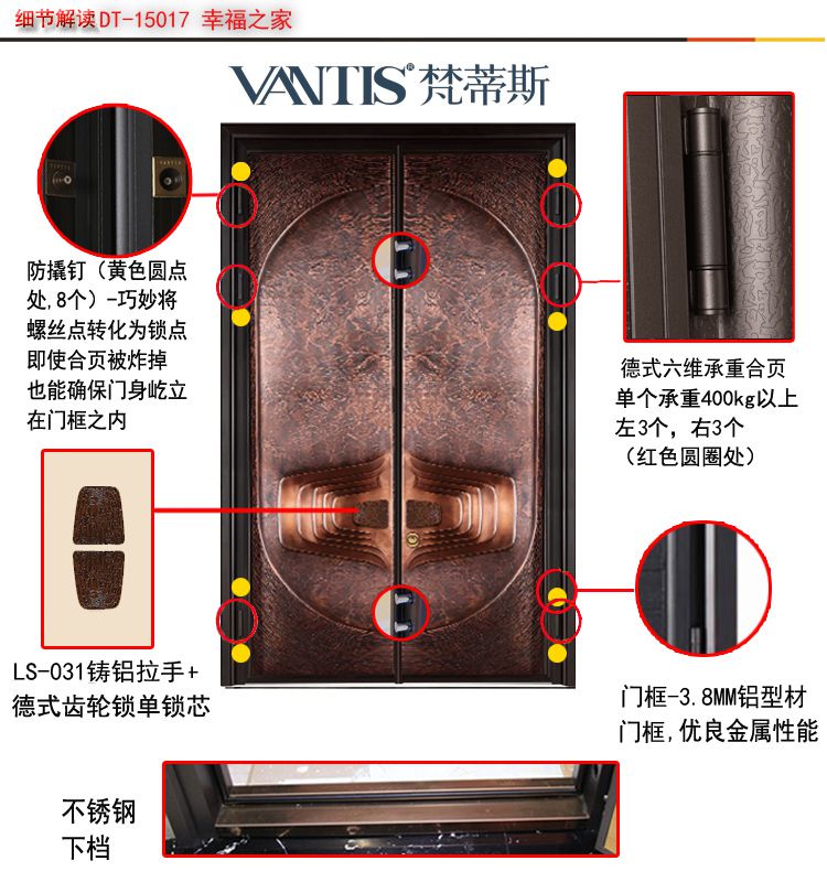 1-铝水整体浇筑(8-20mm防弹级),强烈立体3d效果! 2-防盗防爆防噪保温(隔温)效果 3-进口合页,优良承重性能,开合20万次无任何影响 4-六度手绘着色,德国进口氟碳漆,环保木蜡油,无掉漆,脱漆现象,防腐防锈 5-厂家直销,高端的产品和全方位的服务,尊显您的身份和品味!按平方计算价格