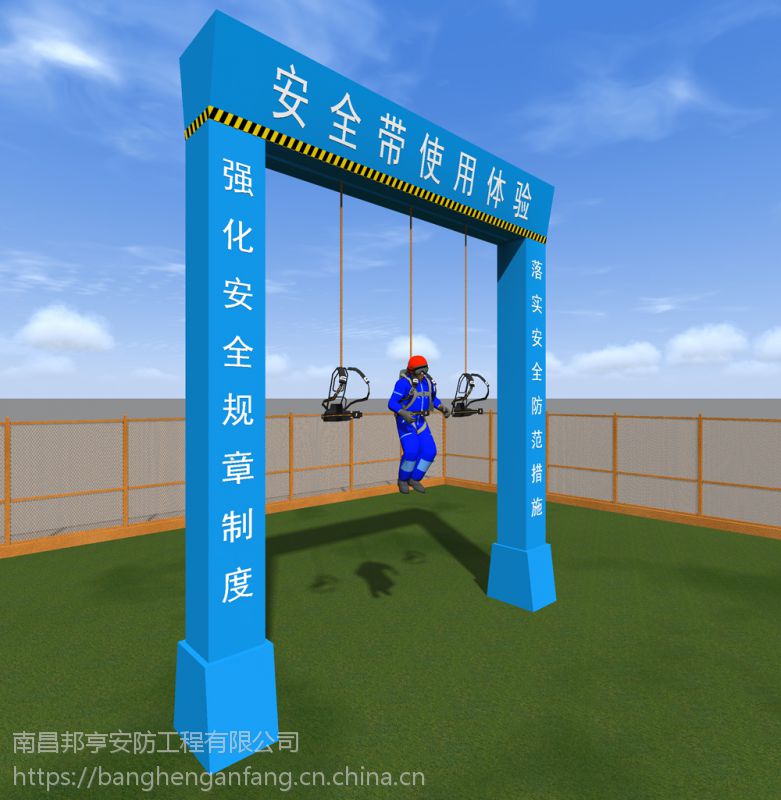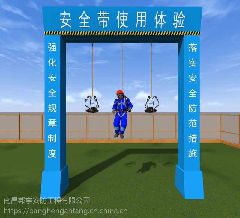 1、安全带体验设置为三人用采用方管焊接式结构,配备遥控装置。尺寸一般为6000*400*6000mm,可根据现场实际尺寸调节。