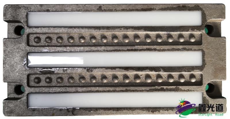 2.高强度抗压,抗震:主体采用铸铁材质,发光区采用高强度工业级环氧树脂胶,发光区与发光区中间设计小圆
