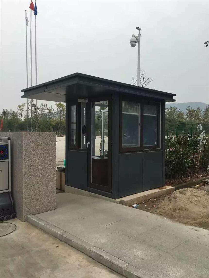 钢结构岗亭整体为镀锌钢结构焊接、外表为氟碳喷漆(颜色可定制)、窗户为铝合金窗户、门为不锈钢门锁、吊顶采用豪华PVC扣板吊顶。内部预留空调机位、空调插座、不锈钢工作台、抽屉、键盘托、吸顶灯、开关插座、电控箱。(以上为岗亭常规配置如有要求可以沟通定制) 钢结构岗亭整体非常坚固,外表喷漆不生锈,并且外观非常美观大气,已经逐渐取代了传统不锈钢岗亭。 适用于停车收费、小区物业门卫、车辆人员进出管理、保安巡逻休息等等。