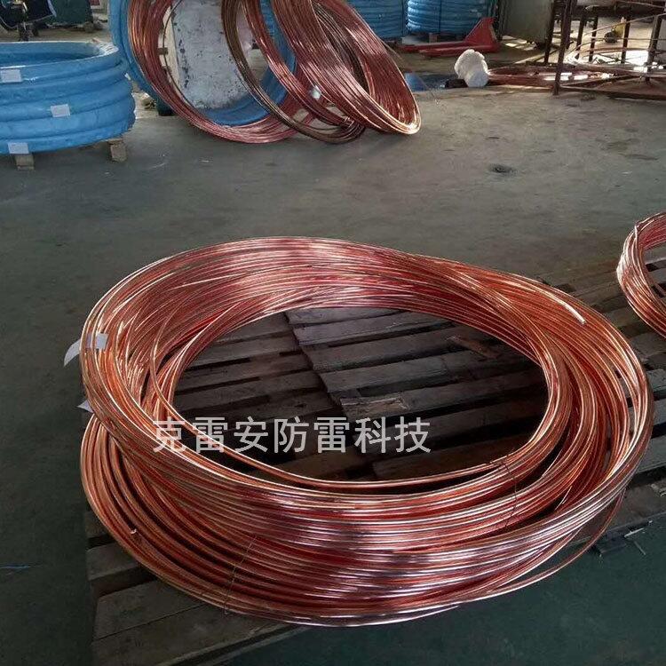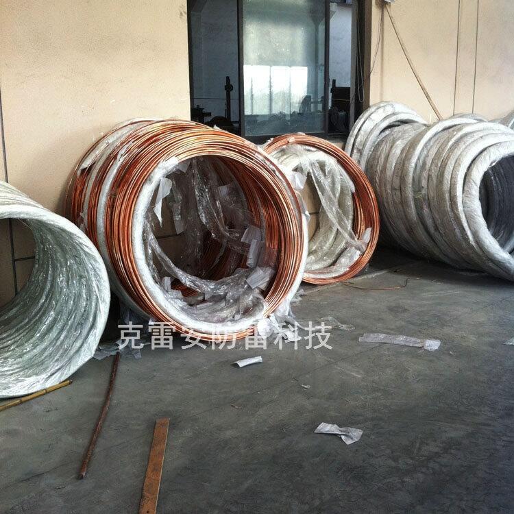 铜包钢圆线制造工艺是采用电镀工艺,电气性能机佳,表层紫铜材料优良的导电特性,使其自身电阻值远远低于常规材料。防腐蚀性优越独特,由于铜钢结合界面采用高温熔接,所以结合面不会出现残留物,不会出现腐蚀现象;表面铜层较厚(平均厚度大于等于0.254mm)耐腐蚀性强,使用寿命长于 50 年,可以大大的减轻检修劳动强度。该适用于不同土壤湿度、温度、PH值及电阻率变化条件下的接地防雷。常用作屋顶女儿墙防雷带和垂直接地引上、引下线、水平接地极连接等.关于引下线,"规范"作如下规定:《GB50057-94》引下线一般采用圆钢或扁钢,其尺寸不小于下列数值: 圆钢直径为 8mm;扁钢截面为 48mm2;扁钢厚度为 4mm。 装在烟囱上的引下线其尺寸不小于:圆钢直径?12mm;扁钢厚度为4mm,截面积为100mm2。 所有引下线要镀锌或涂漆,在腐蚀性较强场所,还应加大截面积或采取其他防腐措施。 引下线的固定支撑点间隔不得大于1.5-2m.