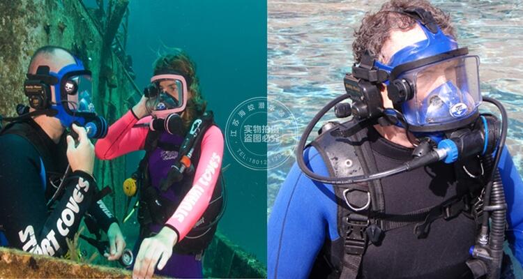 全面罩覆盖整个面部,潜水时不但可以保护面部免受外界伤害,而且具有更宽阔的视野、能够在面罩内更加正常、自由的呼吸。同时免去含着调节器时可能会引起的下巴疲劳。