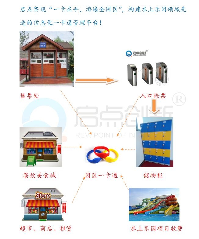 水上乐园及温泉度假村是比较特殊的游乐场所,游客轻装游玩休闲不便携带大量物品及现金。为了避免游客丢失物品或现金等问题造成经营不景气问题和解决游客如何消费及高峰期如何快速售票、检票等方面的难题是本系统的主要解决目标。
