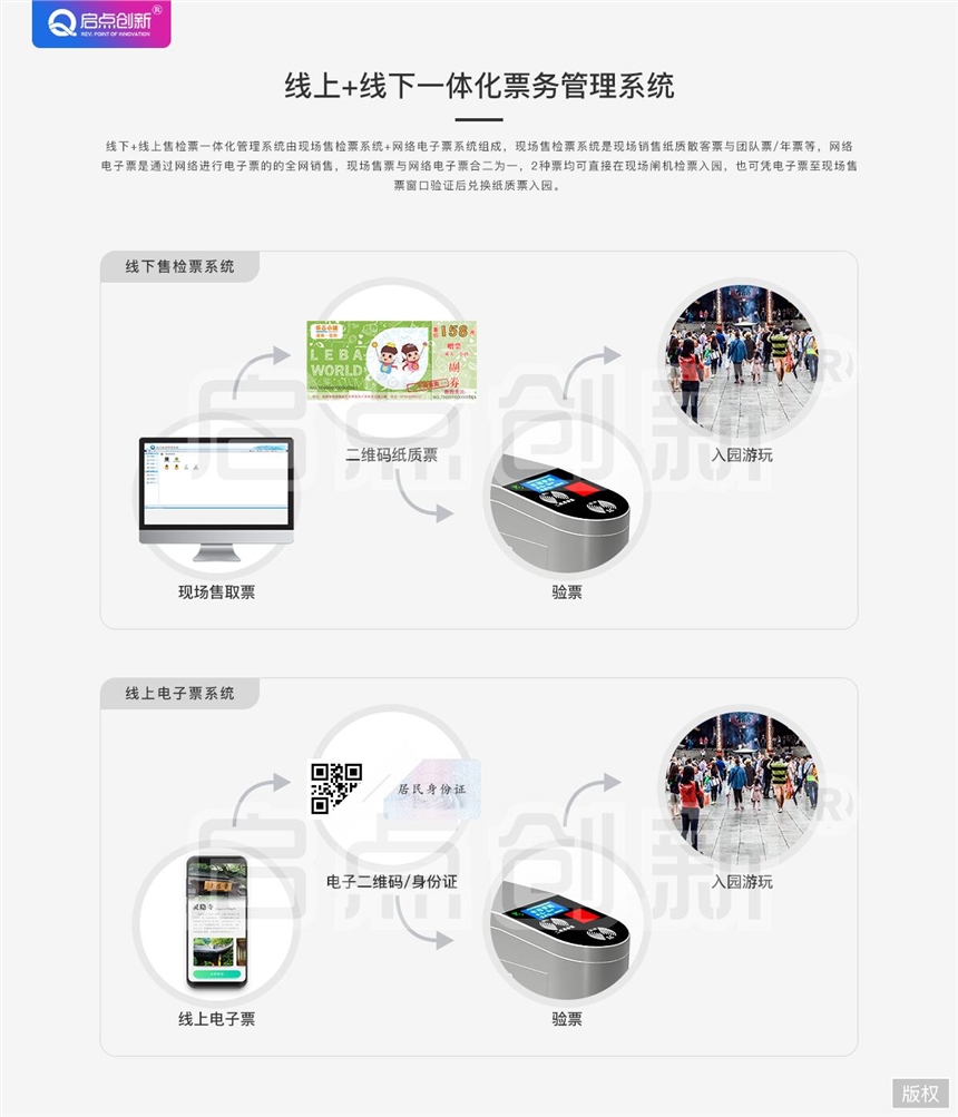 启点创新科技景区电子门票售票检票管理系统采用先进的计算机网络技术及自动控制技术,具有先进性、稳定性和可扩展性;票类设置和通道控制灵活,可满足各种门票管理和核算模式下的应用要求;自主研发的核心部件检票控制器和管理系统软件,可以满足客户的各种特殊需求;工业控制级的产品设计和制造,保证系统具有良好的稳定性和可靠性。