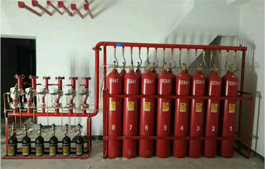 IG-541 混合气体灭火系统由火灾自动探测器、自动报警控制器、自动控制装置、固定灭火装置及管网、喷嘴等组成。具有自动启动、手动启动和机械应急启动三种启动方式。根据使用要求,可以组成单元独立系统或组合分配系统,可以采用全淹没方式,实现对单个防护区、多防护区的消防保护。