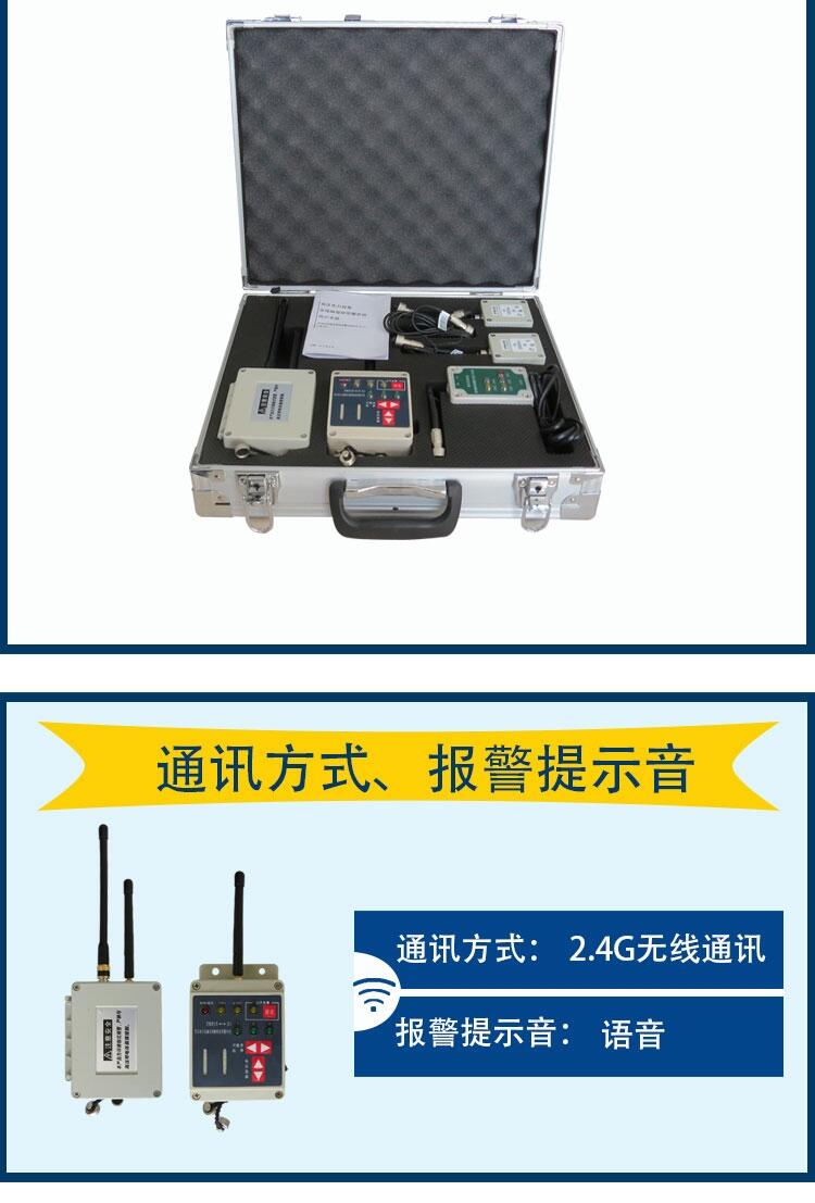 预警系统分为两个模块,即发送端及接收端,发送端安装在机械臂上部用于检测及发送报警信号,接收端安装在操作室内有人机界面用于控制和报警,发送端和接收端通过2.4G无线方式传输数据,无需特别布线同时可采用临时安装方案开箱即用,设备提供无源开关量接口可用于机械限动或驱动其他设备。