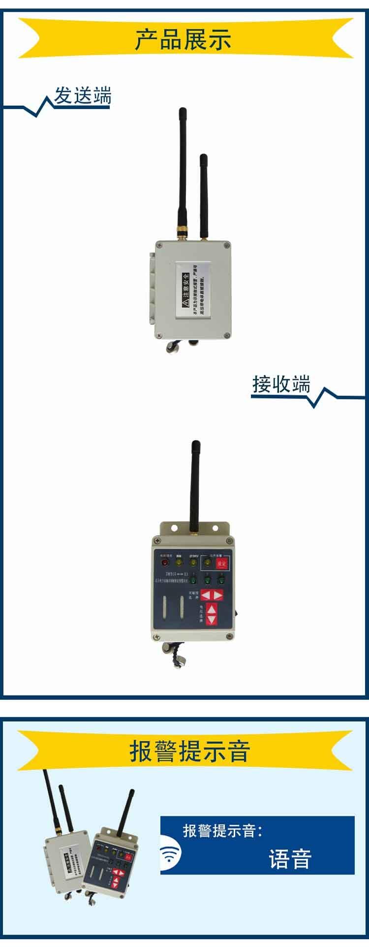 预警系统分为两个模块,即发送端及接收端,发送端安装在机械臂上部用于检测及发送报警信号,接收端安装在操作室内有人机界面用于控制和报警,发送端和接收端通过2.4G无线方式传输数据,无需特别布线同时可采用临时安装方案开箱即用,提供无源开关量接口可用于机械限动或驱动其他设备。