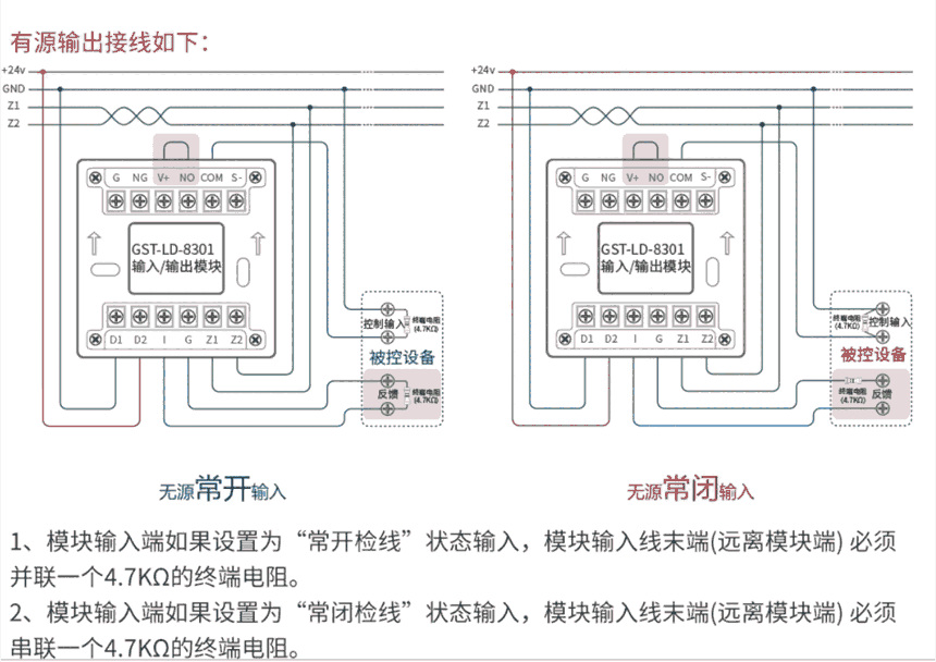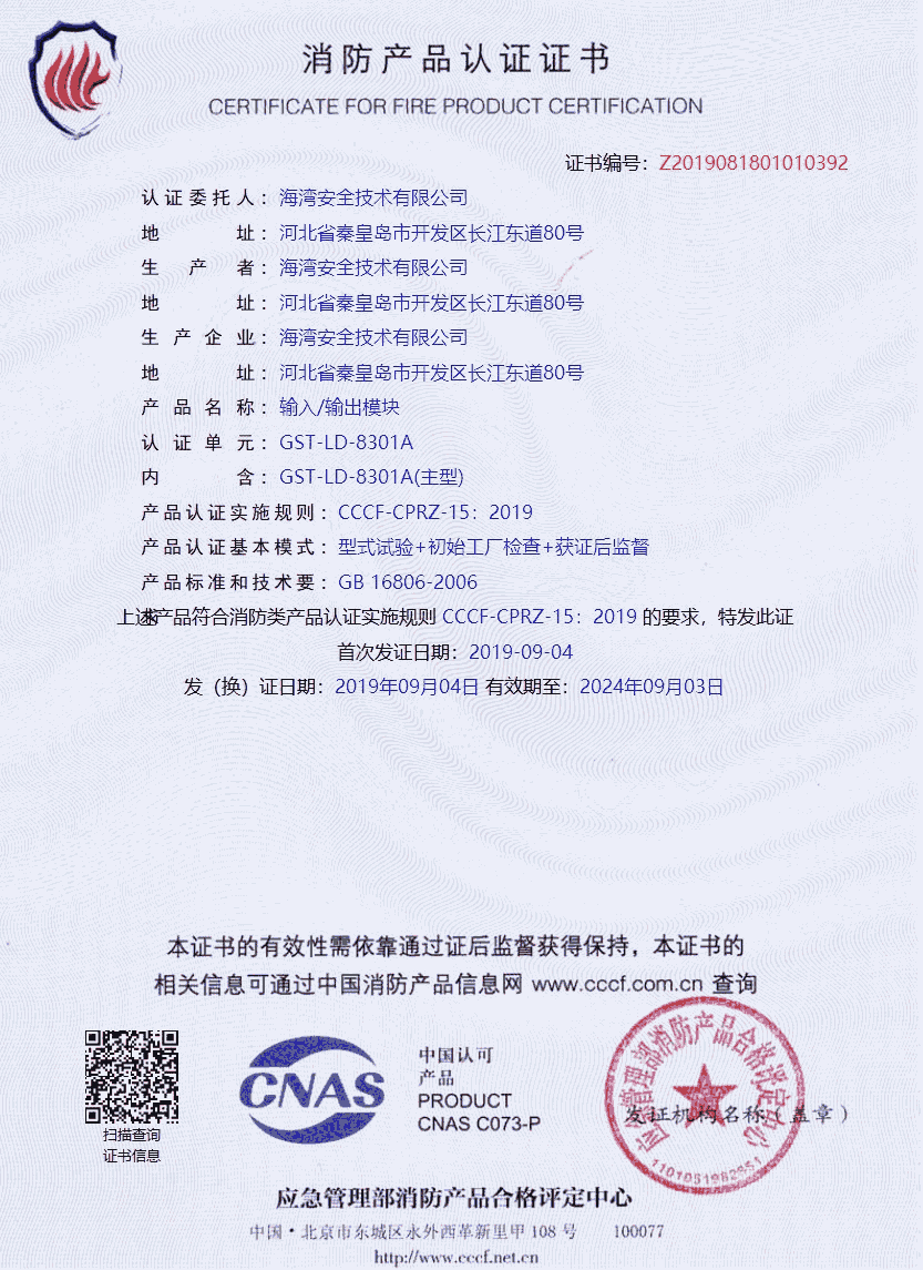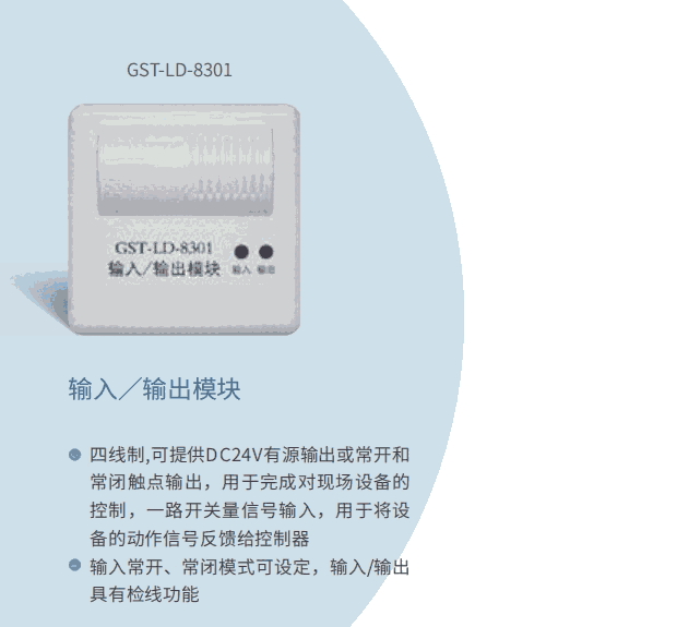 GST-LD-8301输入输出模块,主要用于连接需要火灾报警控制器控制的消防联动设备,如排烟阀、送风阀、防火阀等,并可接收设备的动作回答信号。