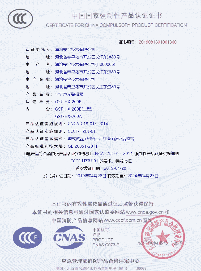 GST-HX-200B火灾声光警报器(以下简称警报器),用于在火灾发生时提醒现场人员注意。警报器是一种安装在现场的声光报警设备,当现场发生火灾并被确认后,可由消防控制中心的火灾报警控制器启动,也可通过安装在现场的手动报警按钮直接启动。启动后警报器发出强烈的声光警号,以达到提醒现场人员注意的目的。在应用于气体喷洒警示时,警报器可以通过短接T、V端子设置为启动后发出机关枪声调。