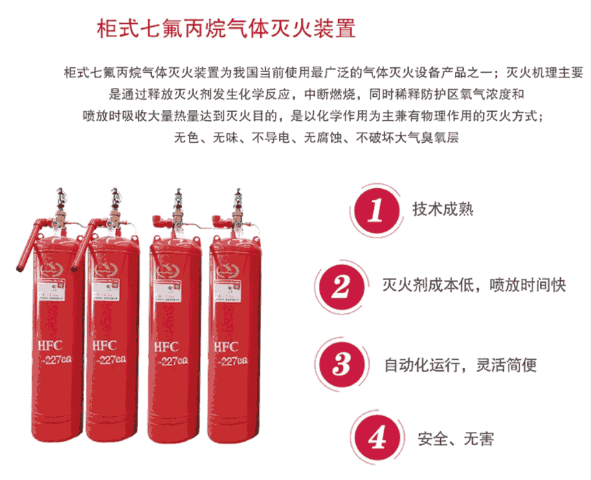七氟丙烷柜式气体灭火装置是一种预制的、以全淹没方式灭火、独立成套、可移动的灭火设备,它安装灵活方便、外形美观、灭火剂无管网损失、灭火效率高。可以与消防控制中心相连接,由火灾报警灭火控制器驱动实施自动灭火;也可以单独配装自动灭火控制器,形成独立自主灭火装置。