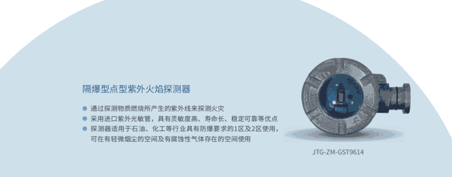 JTG-ZM-GST9614点型紫外火焰探测器为感光型火灾探测器,它通过探测物质燃烧所产生的紫外线来探测火灾,适用于火灾发生时易产生明火的场所,对发生火灾时有强烈的火焰辐射或无阴燃阶段的火灾以及需要对火焰做出快速反应的场所均可采用本探测器。
