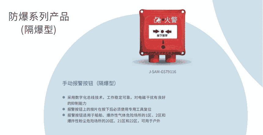 J-SAM-GST9116防爆手动火灾报警按钮安装在船舶及工业防爆场所,当人工确认火灾发生后按下报警按钮上的按片,可向火灾报警控制器发出火灾报警信号。