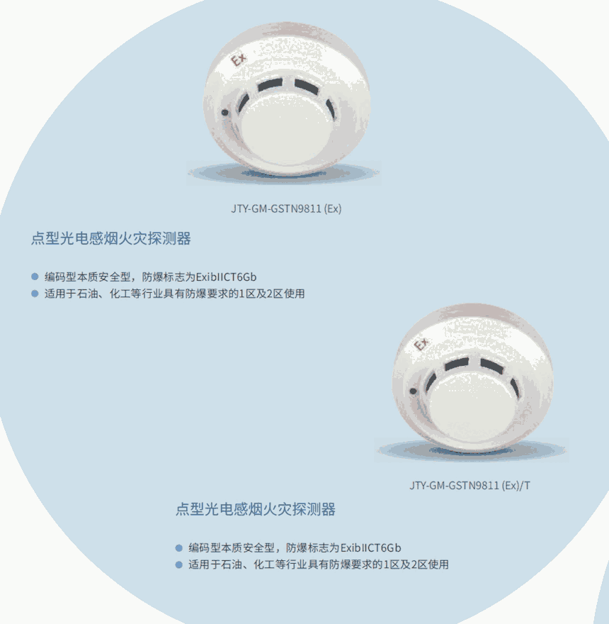 JTY-GF-GST9711(Ex)点型光电感烟火灾探测器(以下简称探测器)为非编码感烟探测器,适用于石油、化工等行业具有防爆要求的I区及II区使用。与GST-LD-8332编址接口模块配合使用,可接入本公司生产的各类火灾报警控制器,完成探测器的信号处理。