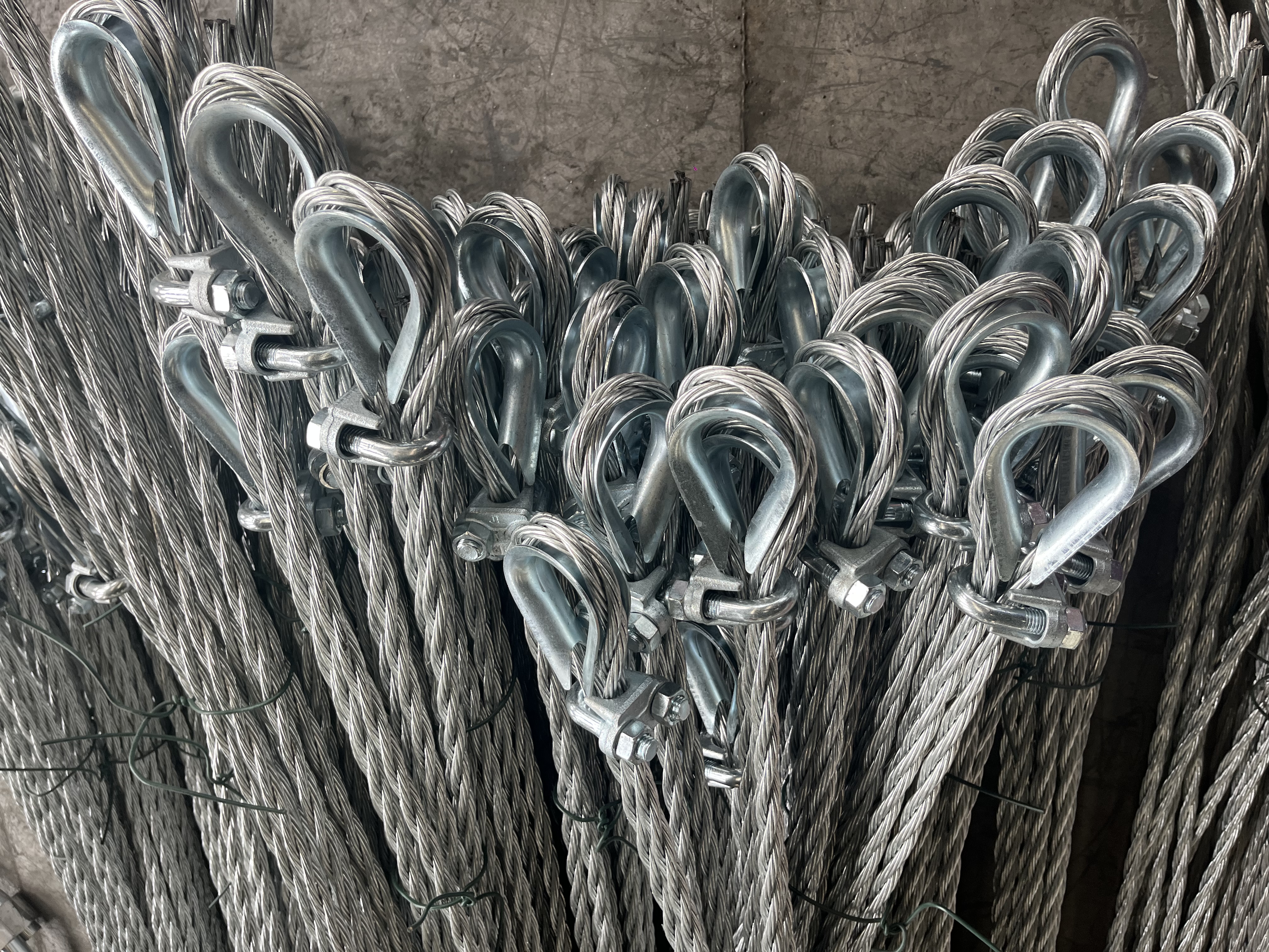 2)钢丝绳网的编制钢丝绳网的编制应满足以下要求: 上下交错编织;编制成网的钢丝绳不得有断丝、脱丝现象;交叉节点处用扣压件固定,接头处用搭接件压接,不得遗漏,钢绳露出搭接件长度至少为10mm;编网时扣压件和搭接件用机械压接,表面不得有破裂和明显损伤;网的形状平整、绳不得有打结明显扭曲现象。