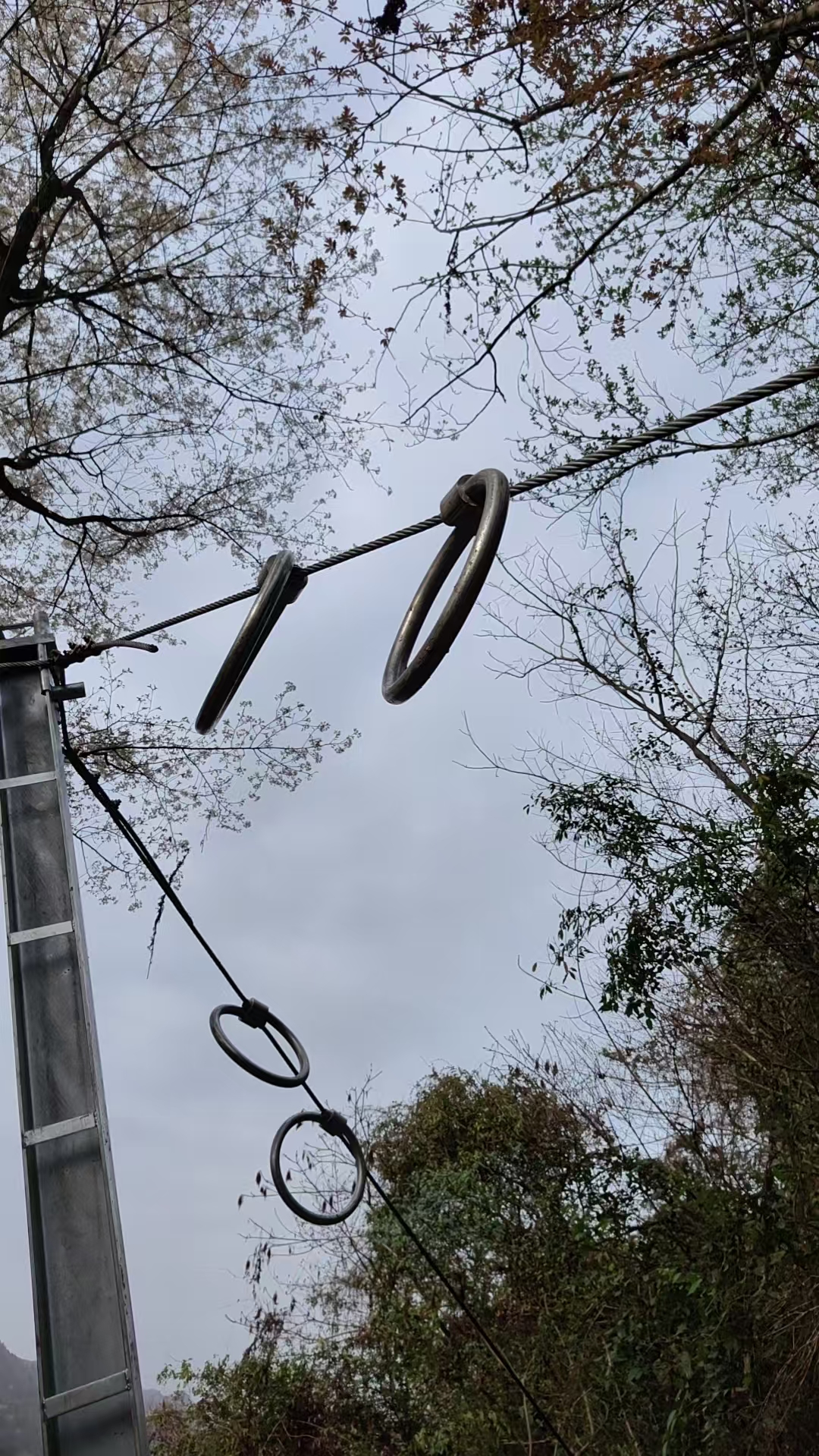 2.9.1 将第一根支撑绳的挂环挂于端柱基座的挂座上,然后沿平行于系统走向的方向上,调直支撑绳并放置于基座的下侧,并将减压环调节就位(距钢柱约为50cm,同一根支撑绳上每一跨的减压环相对于钢柱对称布置:当每跨为单减压环时,应与上部支撑绳的减压环呈对角关系);
