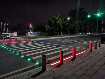 智慧斑马线系统由智能人行检测系统,电源系统,控制系统,信号检测系统,LED发光道钉等组成,LED发光道钉是由铸铁、LED光发器件等特殊材料设计而成,它能提醒过马路的行人,警示过往车辆需礼让行人。该产品耐压,发光部分是乳白色半透明材料,可以让LED灯从 里面发光,即使在雾霾和夜晚的状态下也有很好的可视性。