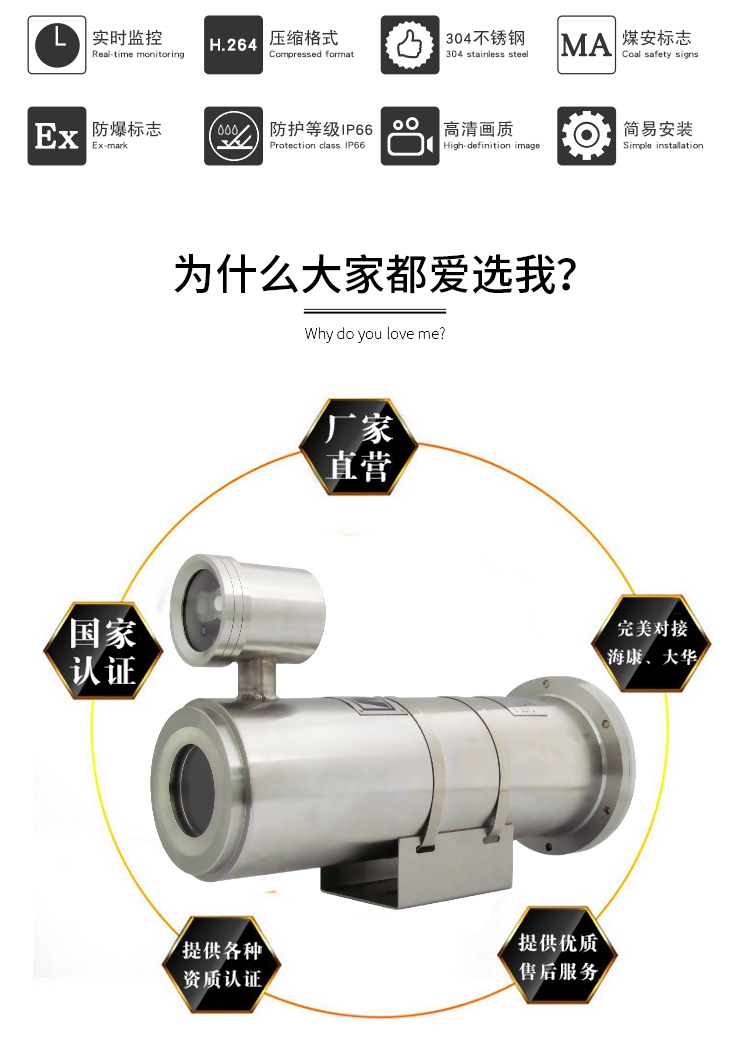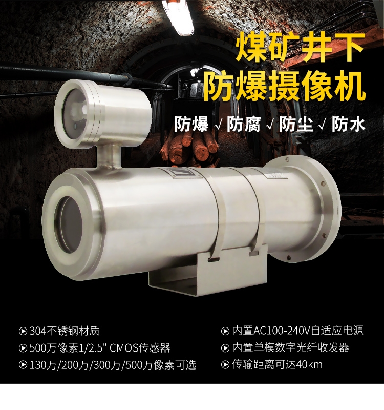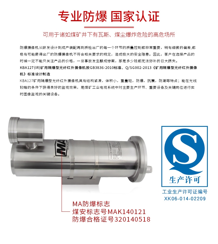 KBA127(IR)网络矿用隔爆型光纤红外摄像机按GB3836-2010标准、Q/SG002-2013《矿用隔爆型光纤红外摄像机》标准设计制造;本摄像机内置AC100-240V自适应电源;采用台湾晶元高亮度、高稳定性、低热量、散热性能好的陶瓷红外灯,可视距离可达80m;单模单路数字光纤收发器,传输距离可达20km;前端匹配500万像素1/2.5" CMOS传感器,200万像素网络高清摄像机;有效像素1920(H)×1080(V)。