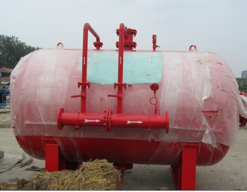 PHYM压力式泡沫比例混合装置的制造依据:GB20031-2005《泡沫灭火系统及通用部件技术条件》。 该装置是低倍数空气泡沫灭火系统(以下简称泡沫系统)中储存和以压力水为动力按比例输出泡沫液与水混合形成混合液的消防装置,由泡沫液储罐、比例混合器、进水管、及控制阀等部件组成。当有火灾发生时,启动消防水泵,压力式比例混合器有压力水通过。其中一小部分水进入储罐内,挤压胶囊,囊内泡沫液在压力水的挤压下置换出等量的泡沫液,进入比例混合器,压力水和泡沫按比例进行自动混合,形成泡沫混合液,经管道输送给泡沫产生器、泡沫枪、泡沫炮或其他泡沫灭火设备,产生空气泡沫扑救火灾。