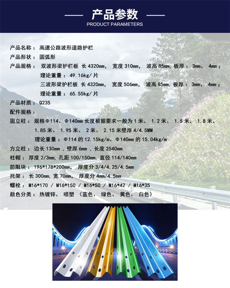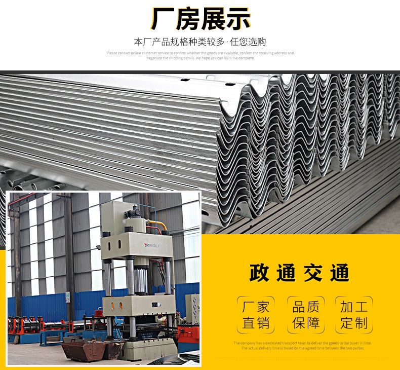 深州市政通交通设施有限公司是生产高速公路波形护栏板和配套产品的生产厂家。专注于高速公路热镀锌防撞护栏板热镀锌喷塑波形护栏板带钢镀锌托架方立柱喷塑托架热镀锌横隔梁热镀锌横梁防阻块喷塑立柱喷塑柱帽。企业具有完善的质量管理体系,检测设备,技术人员为产品提供了可靠的质量保障。公司拥有热镀锌生产线,喷塑线,成型生产线,具有年生产能力热浸波形梁钢 护栏、钢立柱5万吨、喷塑3.5万吨。公司所生产的热镀锌产品均达到国家规定的质量要求,我们将一如既往地以产品满足用户,服务取信用户。我们本着重合同、守信誉、互惠互利、信誉真诚的态度欢迎新老客户看样订货,公司全体员工愿与各界朋友携手合作,共创美好,再造辉煌!