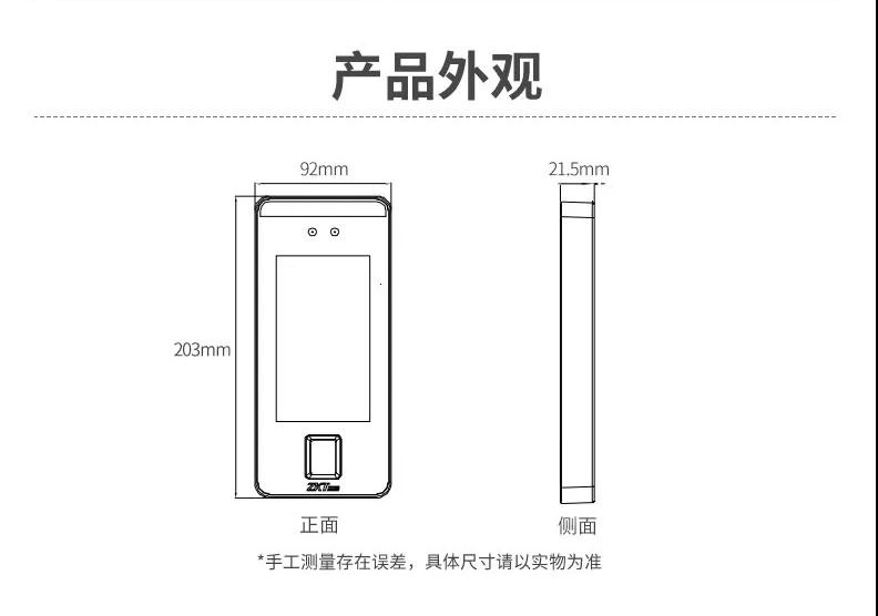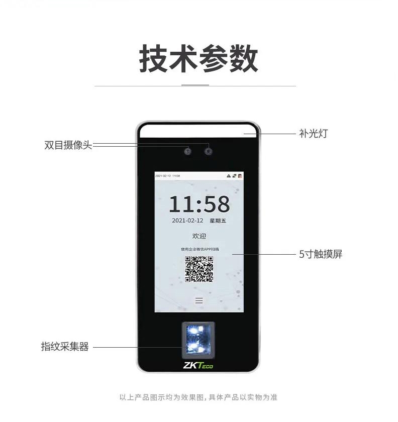 ? ? ZK-F6是中控博业新推出的一款可见光人脸云考勤终端,搭配5寸IPS高清触摸大屏和双目摄像头,宽广视角轻松体验,具有快速读取、动态识别的功能。产品配置Linux操作系统,支持指纹验证、人脸识别等多种验证方式,签到多种选择,轻松考勤;标配Weigand in/out,具有门磁、报警等多种功能,守护工作安全;对接企业微信平台,既可以实现手机考勤,解决客户排队打卡问题,也能随时随地知晓考勤数据,减轻企业管理负担,是您时间管理的优先选择。