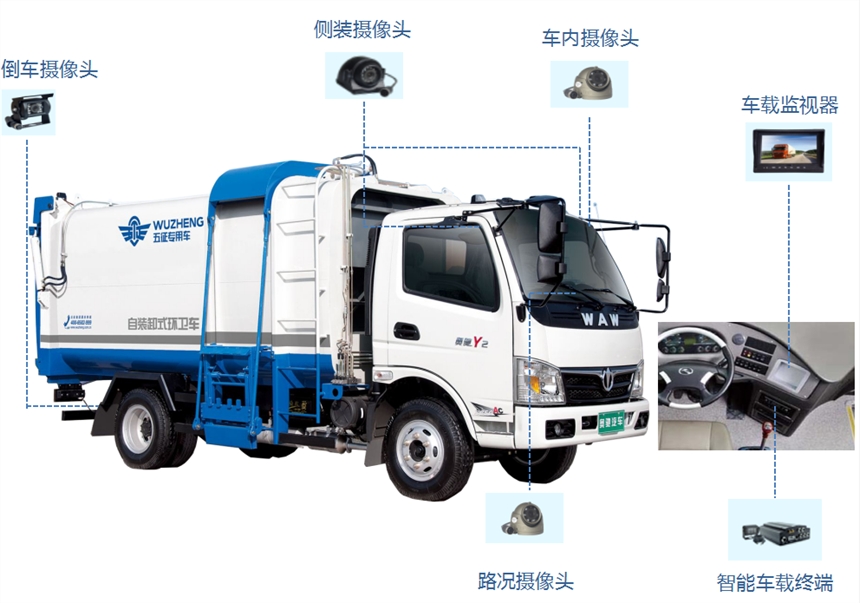 环卫车平台具有中央监控和网络管理系统,将“环卫车”的视频、声音、北斗卫星定位同步实时传输到监控中心,实现以画面双显示,显示远程传输的实时视频+北斗卫星、GPS卫星定位在电子地图的车辆所在位置及行驶信息,接受并存储“清扫车”上传输回来的视频、声音、北斗定位信息,监控中心管理人员在画面上就能实现同步看到、听到、知道、控制得到的实时管理。