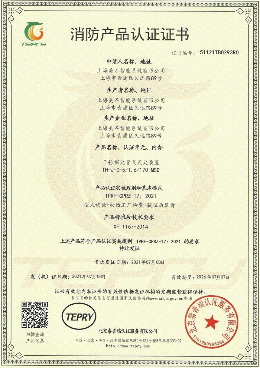 上海美石智能系统有限公司研发制造的iROCK磬石系列感温自启动灭火系统设备分两大系列九个规格品种,获得多项发明,先后通过"固定灭火系统和耐火构件质量监督检验中心\"的检测机构认可。TH-J-C-5/1.6/170-MSD灭火系统适用消防设备。