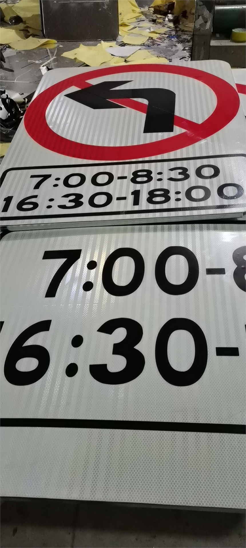 材质特点:1.00-3.00mm铝板厚度,背面安装铝槽(供固定时使用),正面贴反光膜。夜晚反光效果。