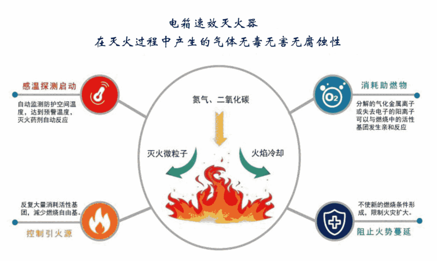 当火灾产生温度达到产品中的感温材料受 热分解温度时,产品感 温灭火组合物会发 生分解反应,产生大量的灭火物质,有氮气、二 氧化碳及一系列灭火微粒子(尺寸在次纳米级别,可漂浮)。