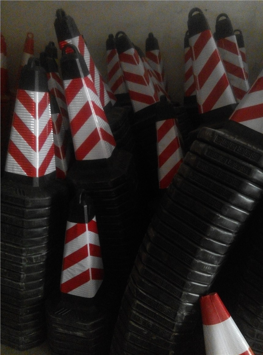 厂家,批发,特价材料:朔料、橡胶、PVC规格:500mm、600mm、700mm、750mm颜色:红白、黄黑特点:良好的柔韧性、抗汽车滚压、硬物撞击不会损坏,耐老化、耐压、耐摔、轻便又耐用。防日晒、不怕风吹雨打、耐热、耐寒、不龟裂、不变色等优点。白红相间颜色醒目,高强级反光膜晚上能反射出耀眼的光芒使驾驶者一目了然。塑料采用塑料高温硫化整体模压而成,集塑料的韧性于一身,具有耐老化、耐压、耐摔、轻便耐用。再配以高反光材料,反光效果好,适用城市路口车道,人行道,建筑物之间的隔离警示。选用优质PE材料,橡胶材料,反光膜。特性:底部可以填充沙和水泥,并通过柜架牢固连接锥身,重量重,坚实稳定性好。顶部圆帽型设计,方便提携,并容易与其他装备连接使用。反光膜宽度宽,明亮醒目,警示效果好,晚上能反射出耀眼的光芒使驾驶者一目了然。