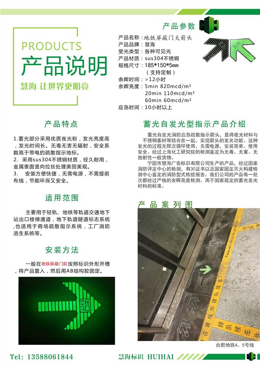 合肥轨道交通消防疏散指示标志,蓄光自发光不锈钢箭头