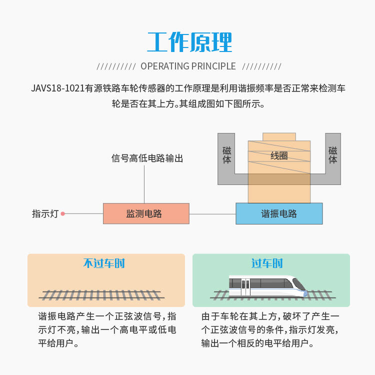 工作方式:非接触感应式(安装时要保障铁路车轮与传感器顶部不能接触);