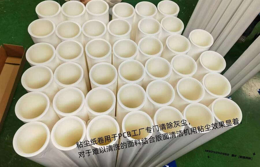 粘尘纸卷用于PCB工厂专门清洁灰尘,对于难以清洗的面料结合版面清洁机用粘尘效淉显著,此外其设计成易切割带状,方便适用。产品规格:290、350、510、600、610、620、650、750、890、1000、1200、1300、1360、1400、1500、1600、1700、1800、1900、2000MM(可根据客户需求定做)(其他规格可以定做)常用长度:20M(可根据需求定做)常用内径:76..2±0.5MM,152.4±0.5MM(可根据需求定做) 粘尘纸卷 620mm~650mm×20m  4支   90粘尘纸卷 700MM--900mm*20m    2支   140粘尘纸卷 1000--1300mm×20m   4支   180产品构造:聚丙烯酸酯胶粘剂PET背面离型层产品特点:环保无污染,无针孔,无味无汽泡,拆开时绝不掉胶、不残胶,无伸缩性,涂胶均匀膜成洁净,切割平整,经久耐用。 应用范围:适用于印制电路板,轻离型适应于单向式版面清洁机,重离型适应于反复式版面清洁机;同时也适用于液晶显面板、导光板、精密印刷及半导体等制作过程中清洁除尘之用。