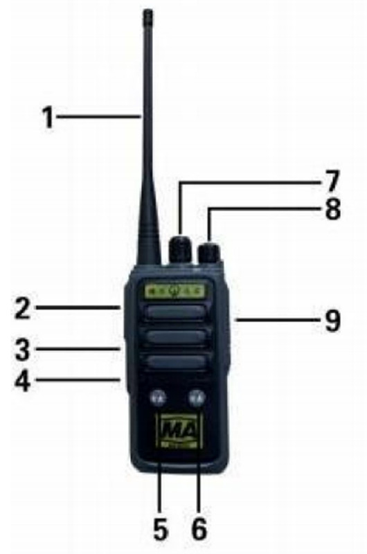 1.天线            2.送话键        3.电量播报         4.静噪开关      5.采煤机控制按键