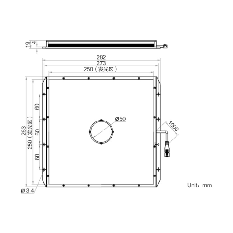 MV-LBES-H-250-250-W 海康机器人工业相机用开孔面光源,250x250 命名规则: MV-LBES-H-250-250-W 海康机器人工业相机用开孔面光源,250x250 照度分布图: MV-LBES-H-250-250-W 海康机器人工业相机用开孔面光源,250x250 外形尺寸: MV-LBES-H-250-250-W 海康机器人工业相机用开孔面光源,250x250 详细技术参数: 型号 型号 MV-LBES-H-250-250-W 名称 开孔面光源,250x250 性能 颜色 白色 中心照度 ≥ 28000 lux@200 mm 色温 波长 / 电气特性 功率 59 W 输出电压 24 VDC 接口类型 SMR-03V-B 结构 外形尺寸 282 mm × 263 mm × 19 mm 发光区尺寸 250 mm × 250 mm 开孔尺寸 ? 50 mm 重量 1.1 kg 供电线长度 1 m 冷却方式 自然冷却 温度 工作温度0 ~ 40°C,储藏温度-20 ~ 60°C 湿度 20 ~ 90%RH无冷凝 漫射板 标配