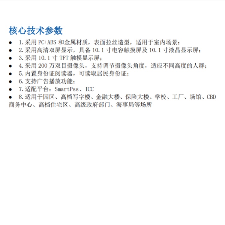 DH-ASHZ530A-W 大华安卓10寸双屏台式人证终端 采用 PC+ABS 和金属材质 采用高清双屏显示,具备10.1寸电容触摸屏及 10.1寸液晶显示屏 采用 200 万双目摄像头,支持调节摄像头角度,适应不同高度的人群 内置身份证阅读器,可读取居民身份证 支持广告播放功能 适配平台:SmartPss、ICC 人脸识别身高范围 0.9m~2.4m 人脸识别距离 0.3m~1.0m 人脸识别准确率 0.9999 人脸识别速度 0.2s 人证比对时间 2.5s DH-ASHZ530A-W
