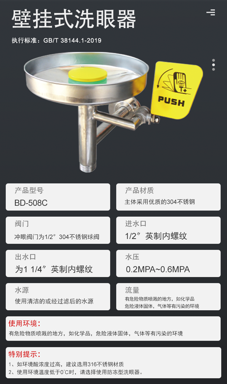 贝迪BRADY单头304不锈钢盆壁挂式洗眼器BD-508C价格可议