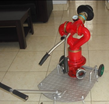 该移动式消防炮主要由移动地盘、拖把、进水管、回转体、炮头等机构组成; 配有两个直径65进水口; 在同一压力下,水炮的流量可调整,并可实施直流至90度水雾射流的无级调节,起到更好的灭火降温效果; 具有很好的灭火性能。 它可根据火场情况喷出雾状细小水滴也可喷射直流水柱.流量可按需要在30-50L/S的范围调节.操作灵活,方便、简单、炮身可作水平、俯仰回转并可实现自锁等功能,有利于操作人员撤离火场实现无人喷射.该炮具有流量可调射程远,功能多,体积小,性能好的特点。