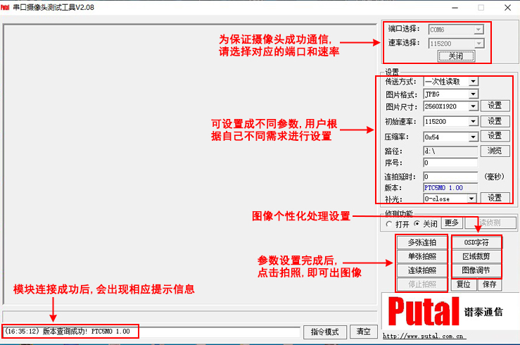 内置PTC5M0系列高性能摄像头模组,输出标准JPEG图片格式,分辨率可达2560x1920,波特率可达921600bps。