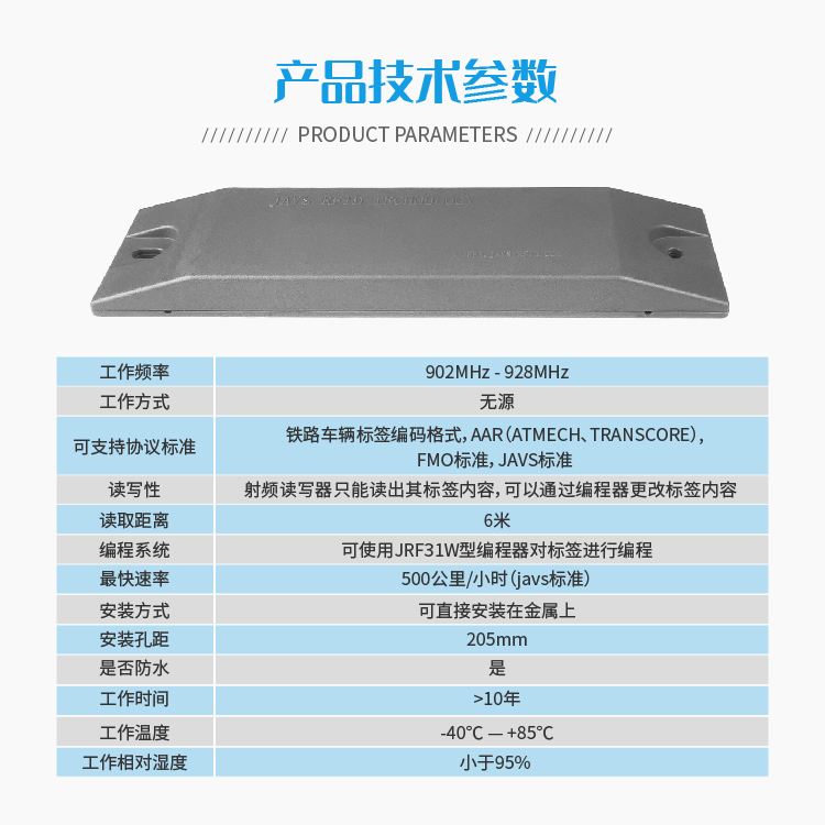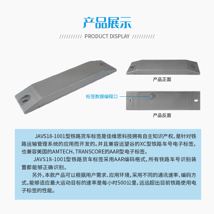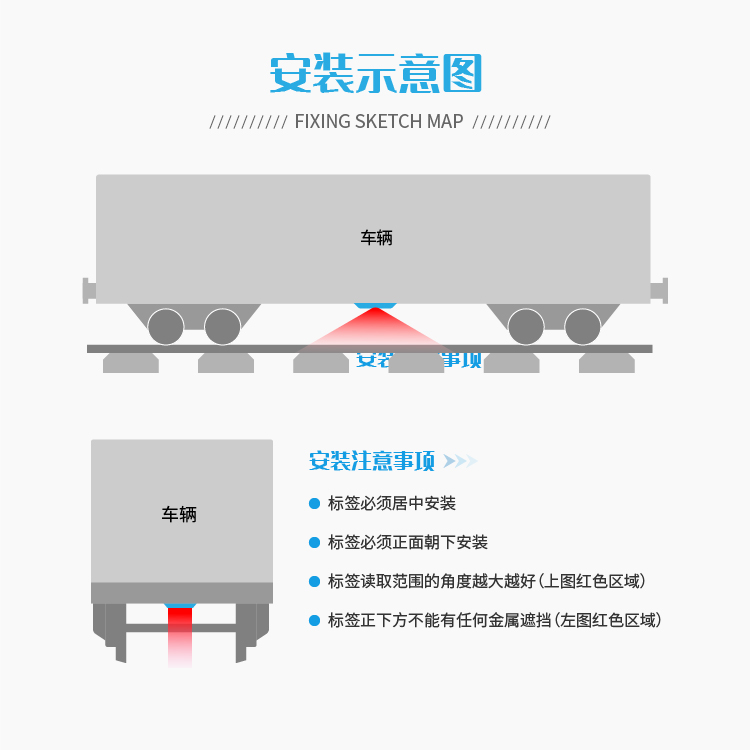 铁路电子标签分三种类型,分别为车辆电子标签、机车电子标签、客车电子标签。安装在货车、机车、客车底部的中梁上,由微带天线、反射调制器、编码器、微处理器和存储器组成。每个电子标签相当于每辆车的“身份证”。