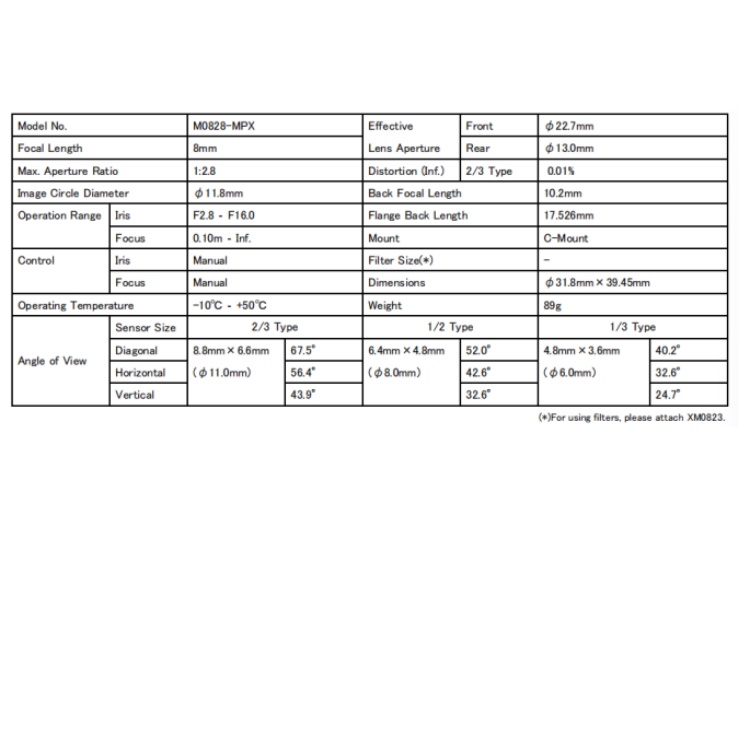 M0828-MPX 日本Computar康标达1600万像素2/3英寸8mm定焦光圈范围F2.8 ‐ F16.0 C接口机器视觉工业镜头 详细技术参数: