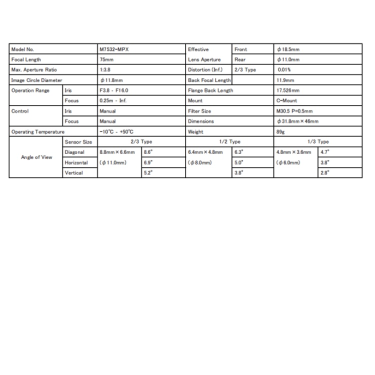 M7532-MPX 日本Computar康标达1600万像素2/3英寸75mm定焦光圈范围F3.8 ‐ F16.0 C接口机器视觉工业镜头 详细技术参数: