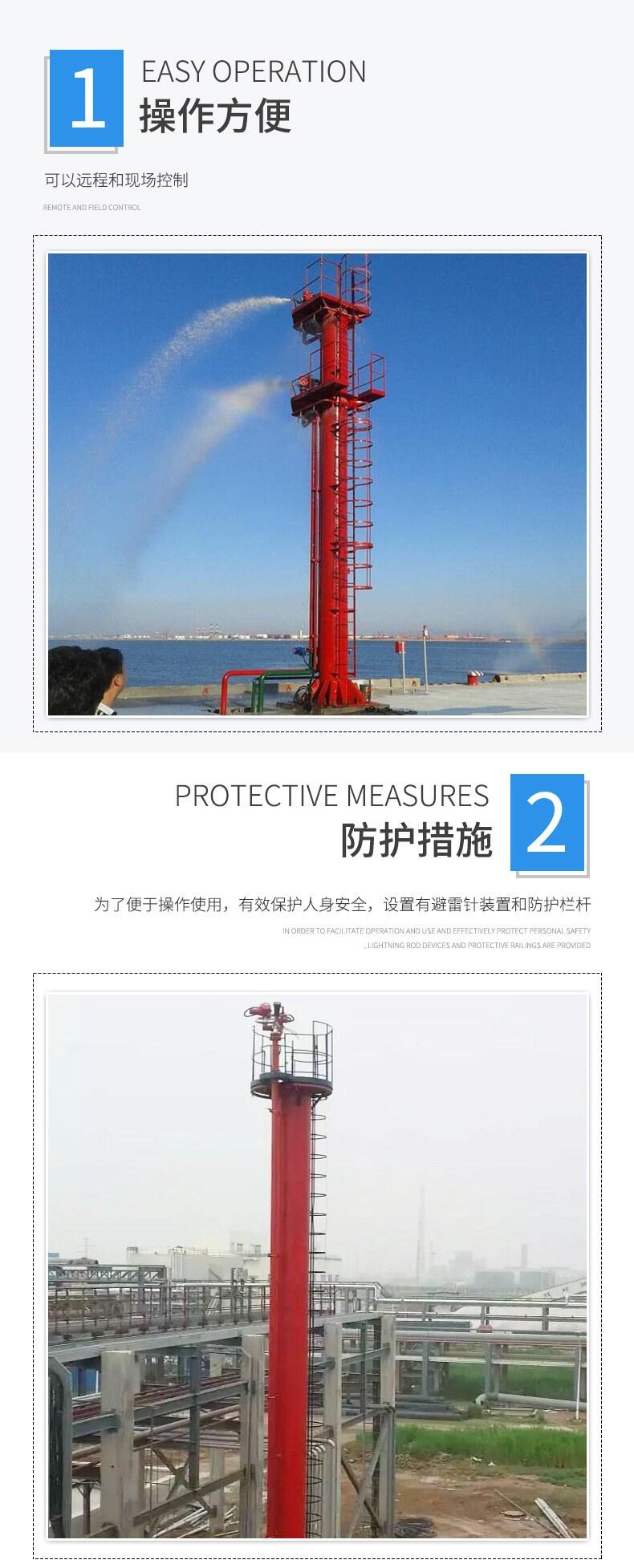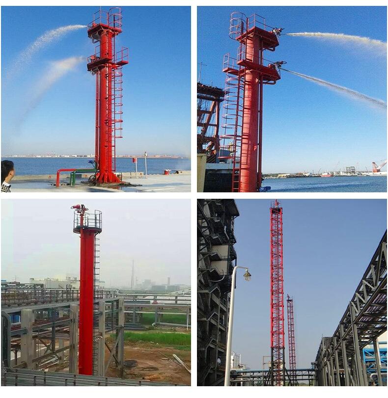 消防炮塔是一种固定在特定位置的消防装置,一般可以远程和现场控制。塔分一或两屋。有消防清水泡和泡沫炮。当发生险情时,可以在控制室操作台启动消防清水泡或泡沫炮或两者同时启动,并远程可以对相应炮管进行上、下、左、右移动,以调整姿态对着火点进行灭火和降温。