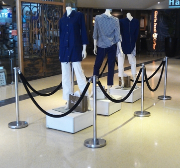 二、一般大型国际机场大厅内会有一些艺术品的摆放,艺术品周围也离不开一米线隔离栏杆座的围护,此地选配较多的也是高档大气的礼宾挂绳隔离带,圆球款式的栏杆座立柱搭配红色挂绳,将展术品的一圈都围起来,会显示展示品的尊贵典雅。