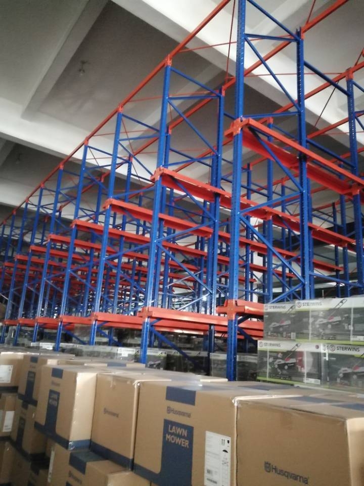 高密度储存,先进后出,部分按单取货,20%-30%可选,取货的速度一般,储货净空可达整个仓库的60%。