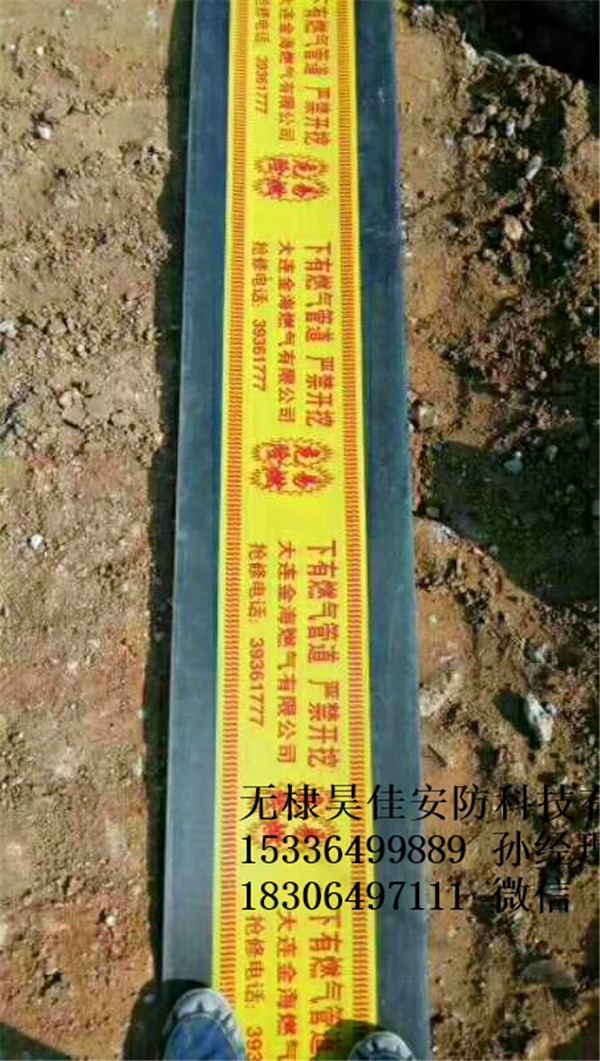地埋式警示带施工方便,施工与埋管同时进行,埋覆于地下与管线中间,铺设在管道上面30-50CM处,起到警示标志作用,以免今后开挖施工时管线受无谓损伤,而造成重大事故,避免因意外损坏造成巨大的财产和经济损失,是各种直埋式管道、线缆安全防护的经济有效、简单易行的用品。