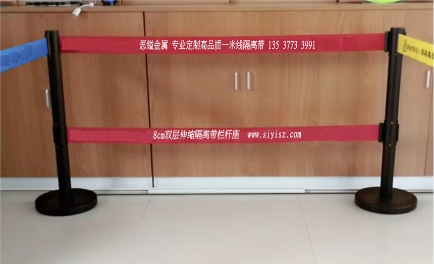 机场加宽一米线隔离带可搭配不同颜色的带子,按不同区域摆放。有效防止公共场所排队行人从底部穿过,带子加宽到足8cm,印上提示语或广告标语,远远就能一目了然。