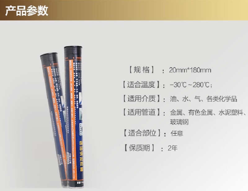 一、形状如橡皮泥、当金属管线和容器罐穿孔泄漏,用此品可以在泄漏时直接塞堵到泄漏孔上,也可以粘接在薄弱部位起到加强作用,堵漏补强佳品。