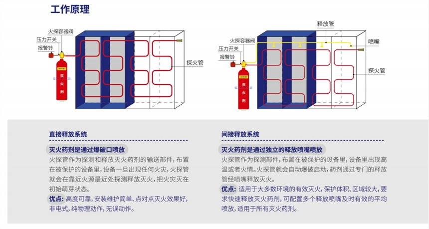 1.灭火剂输送管兼有火灾探测、灭火装置启动及灭火剂喷放功能,不再需要火灾报警与探测装置,从而降低成本及安装难度,也大大提高了灭火装置的可靠性,避免了电控报警部件的误动作。