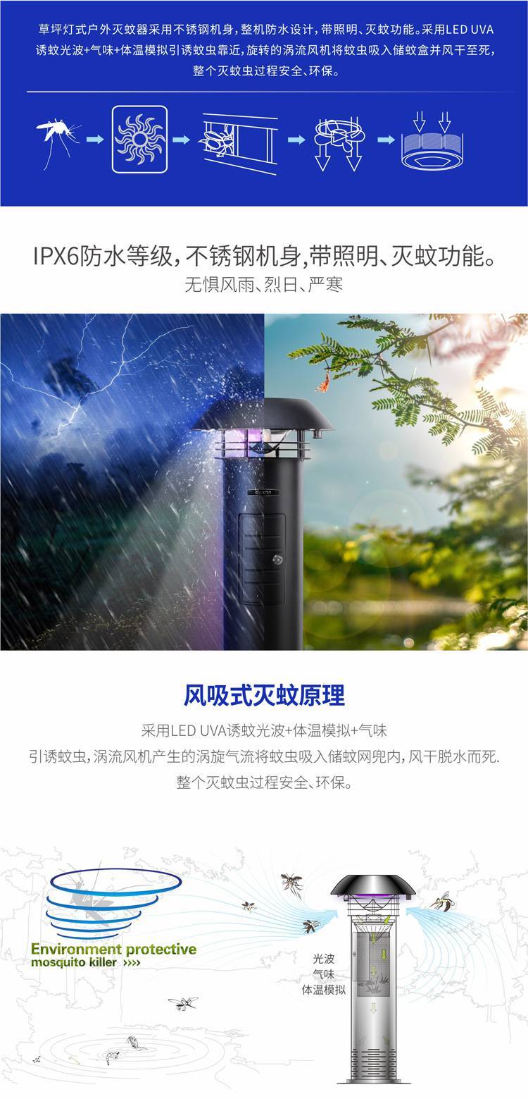 全新草坪灯式灭蚊器使用不锈钢机身,工业设计造型美观,具户外照明、灭蚊、环境装饰一体化功能。运用生物诱蚊技术和物理灭蚊设备,采用光波 气味 热感模拟引诱蚊虫靠近,高速旋转的涡流风机将蚊虫吸入储蚊网兜并风干至死,安全防水。适用于物业小区、别墅花园、学校灭蚊从而达到绿色除虫、环保灭蚊的目的。